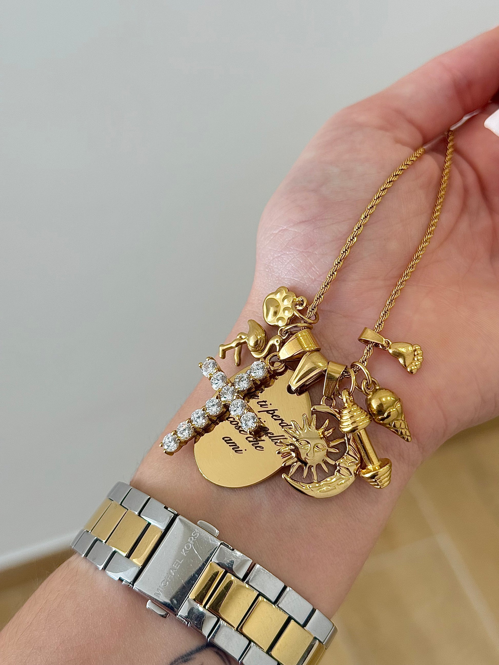 Disponibile in Gold e Silver, il ciondolo misura 2 cm ed è dotato del suo pratico porta-ciondolo. La catenina può essere scelta separatamente, permettendo di creare un look unico e personale.