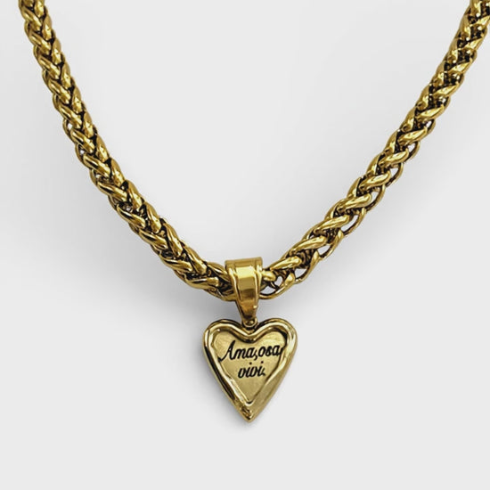 La Collana Ama, Osa, Vivi è un gioiello statement che unisce stile audace e messaggio ispirazionale. Caratterizzata da una catena a maglia grossa che cattura l'attenzione e da un ciondolo a cuore con la scritta incisa "Ama, osa, vivi", questa collana è perfetta per chi vuole esprimere la propria personalità con forza e autenticità.